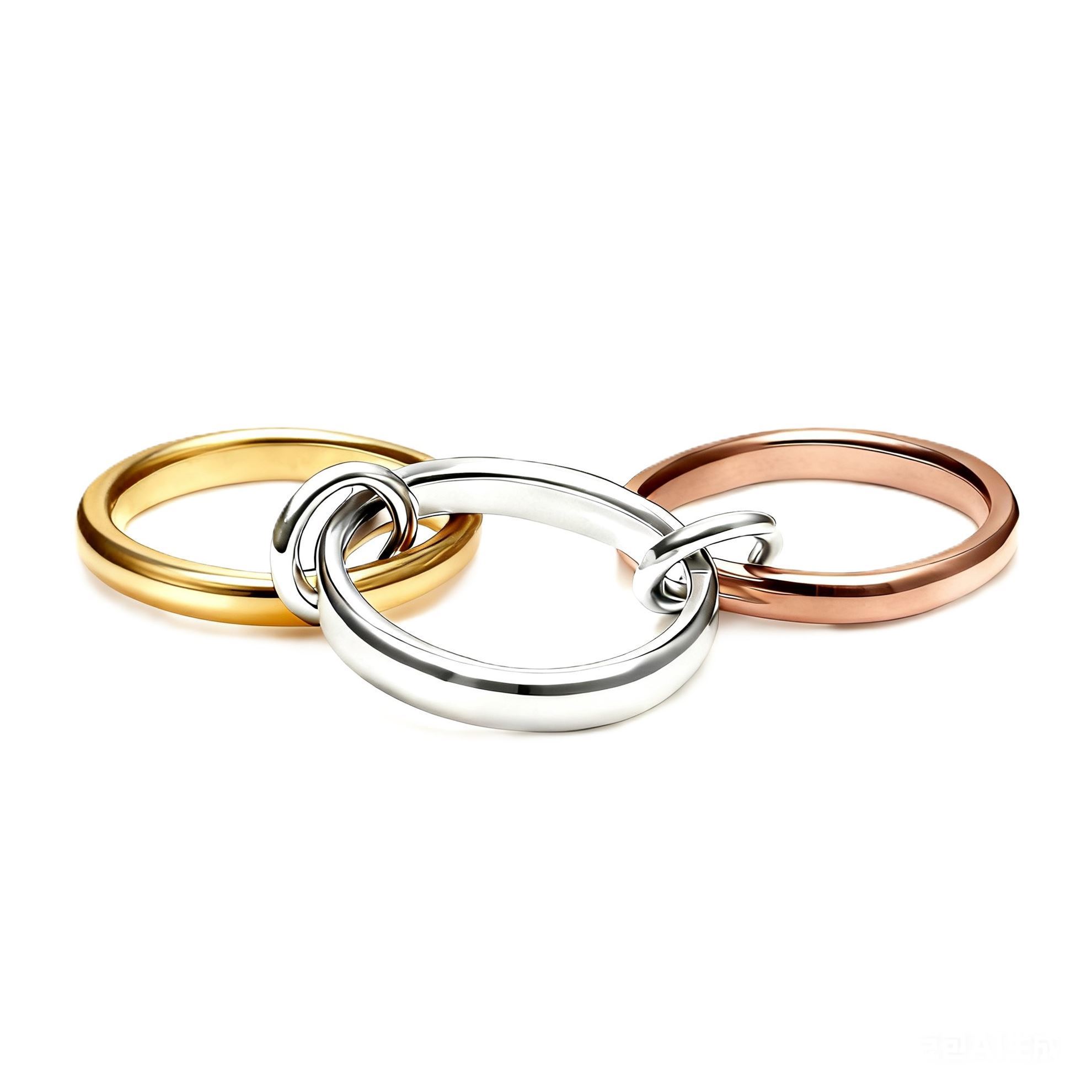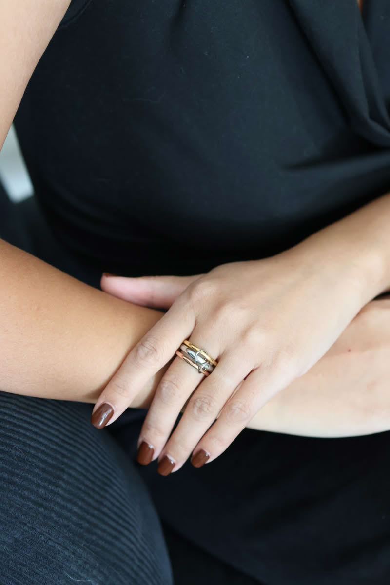 L'Anello Amalia, realizzato in acciaio inossidabile, vanta un design di tre anelli intrecciati. Disponibile in tre varianti (argento, oro, tricolore),