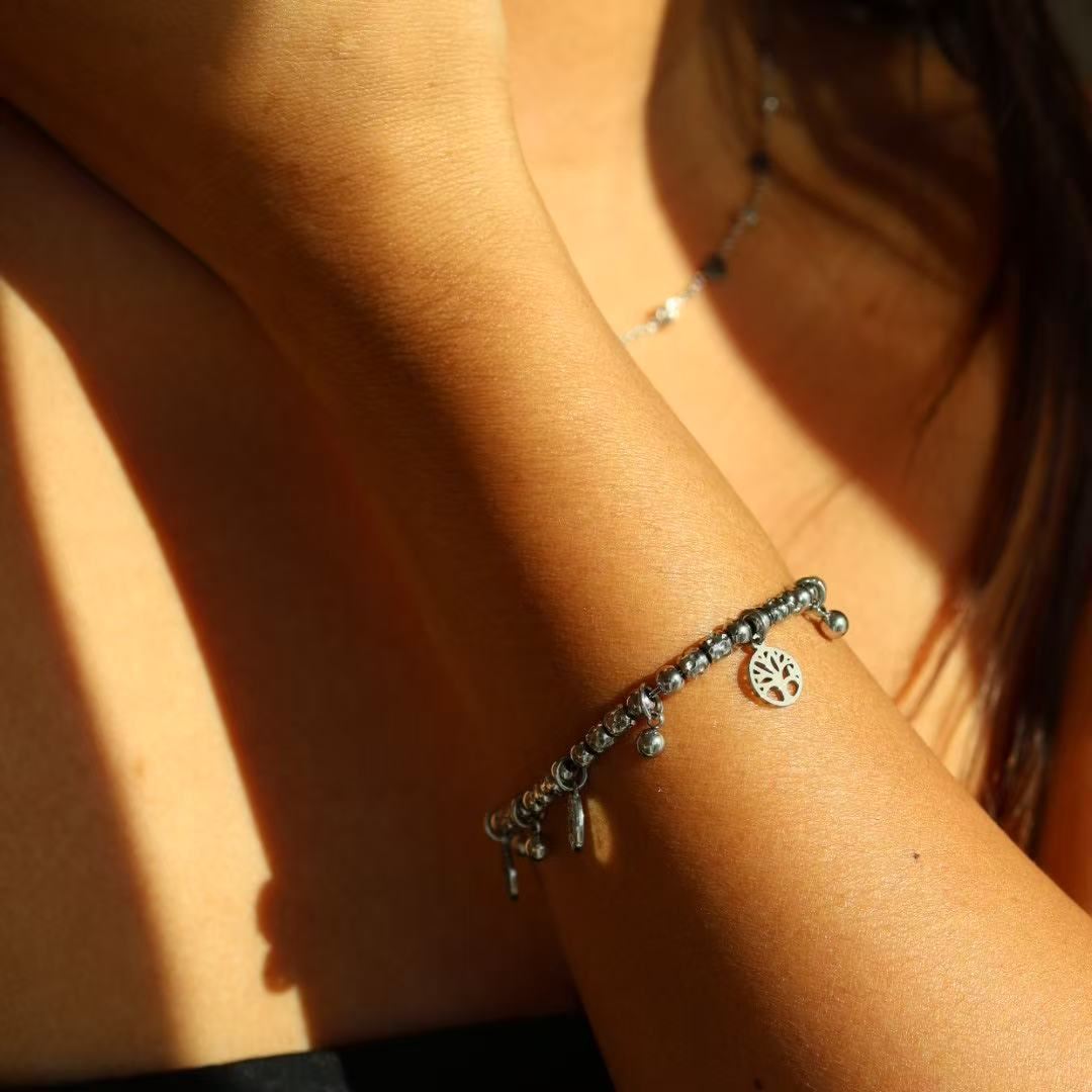 I pallini e i pendenti aggiungono un'aspetto dinamico e tridimensionale al bracciale.