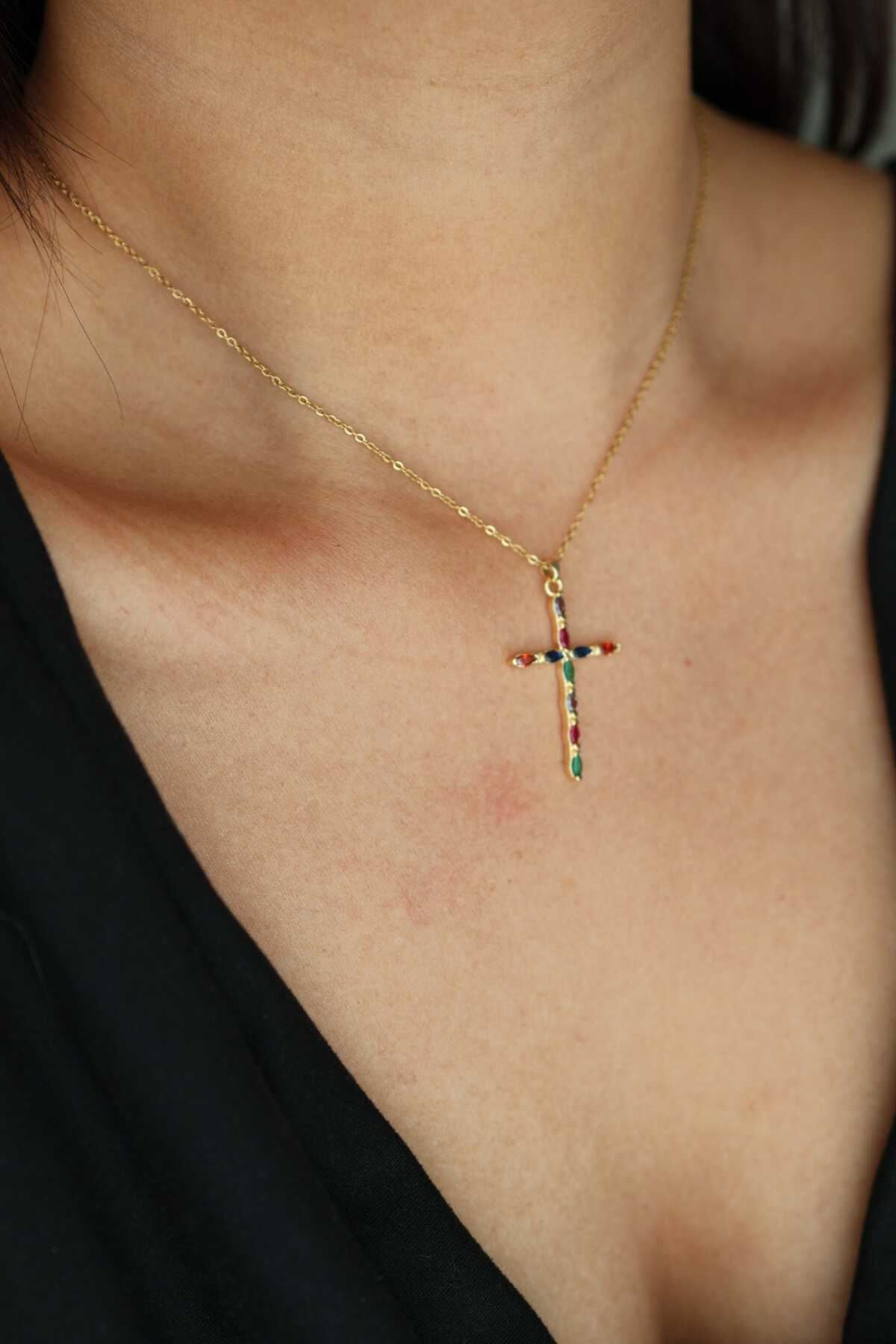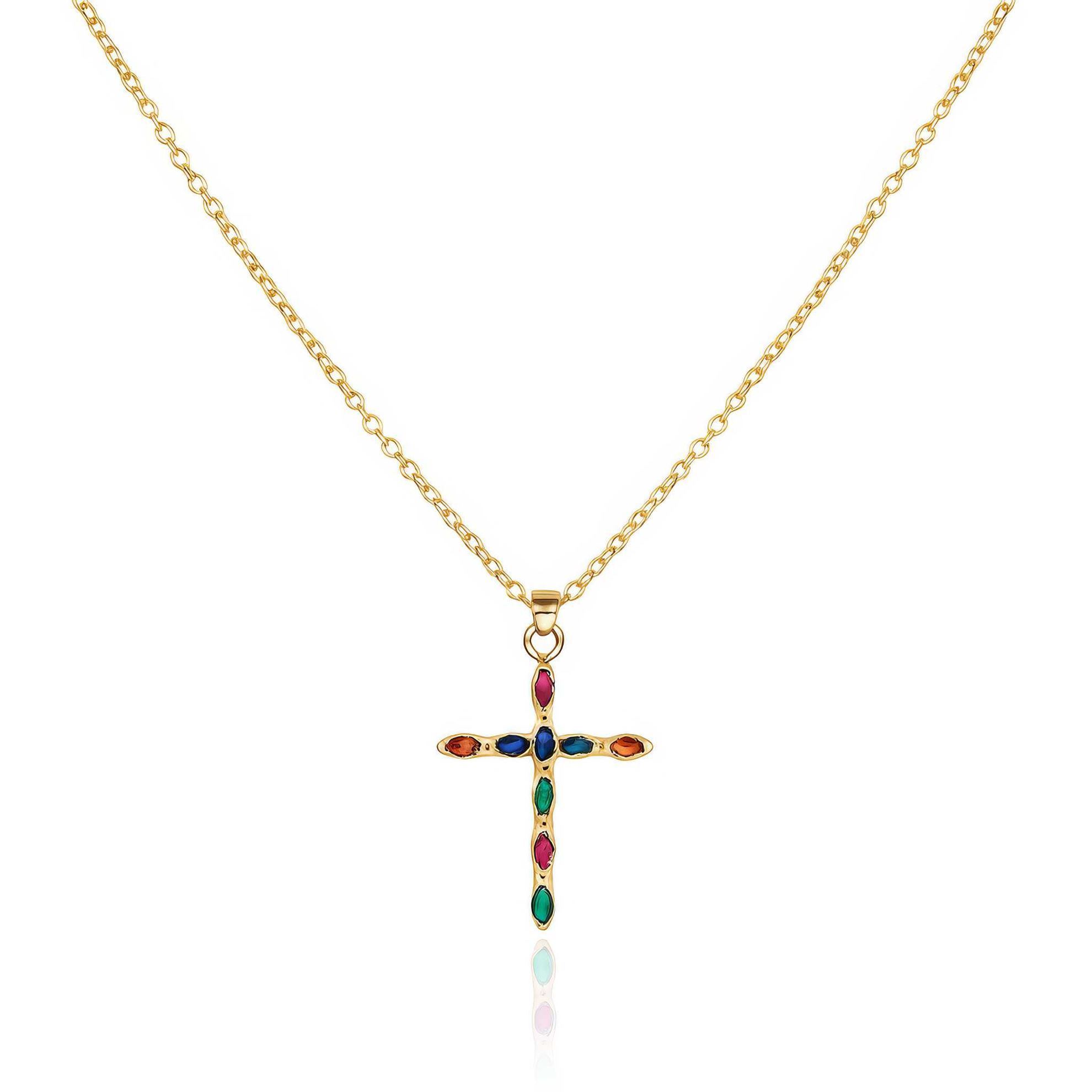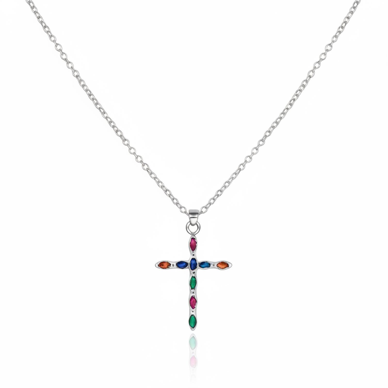 Il pendente a forma di croce, misurato 21mm X 35mm, è il cuore di questa collana. Abbellito con pietre sintetiche colorate, dona un tocco di vitalità e originalità al design tradizionale. Le diverse tonalità di colore creano un effetto di contrasto affascinante, che cattura immediatamente l'attenzione.