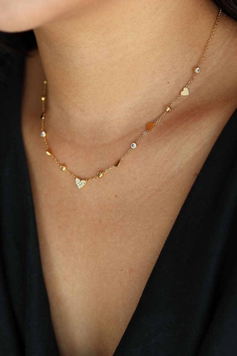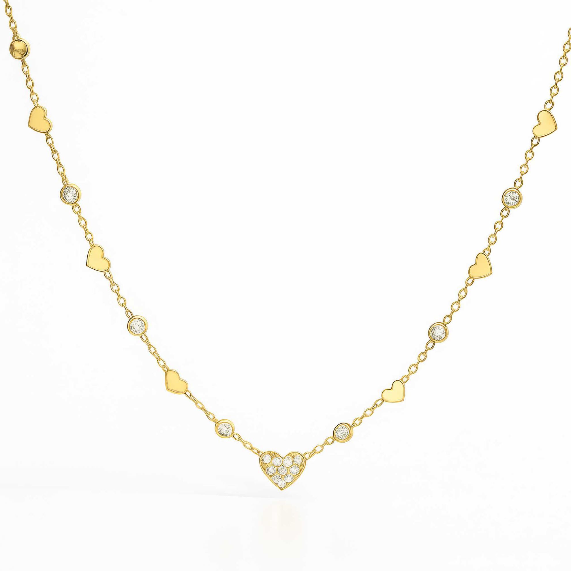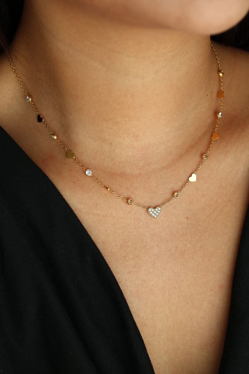 Il design della collana è ispirato all'amore, con un delicato pendente a forma di cuore che cattura l'essenza del sentimento. Il cuore è abbellito da brillantini in zircone che, con la loro scintillante luce, donano un tocco di magia e fascino al pezzo. La catena, decorata con piccoli elementi a forma di cuore e altri brillantini, aggiunge un ulteriore livello di dettaglio e raffinatezza.