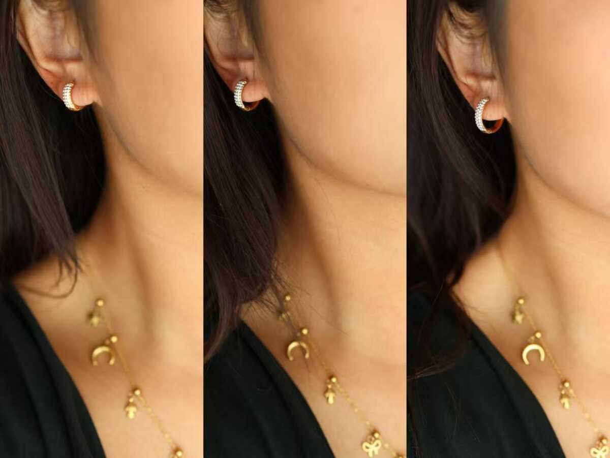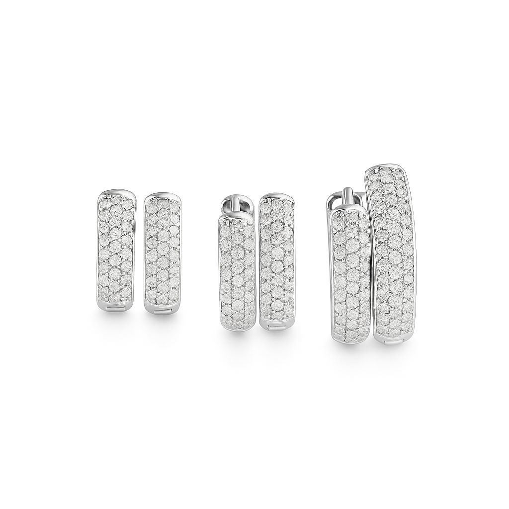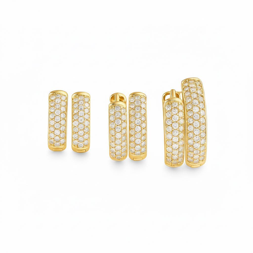 Questi orecchini presentano un design a cerchietto, interamente incastonato con brillantini in zircone che donano un bagliore affascinante e un tocco di lusso.