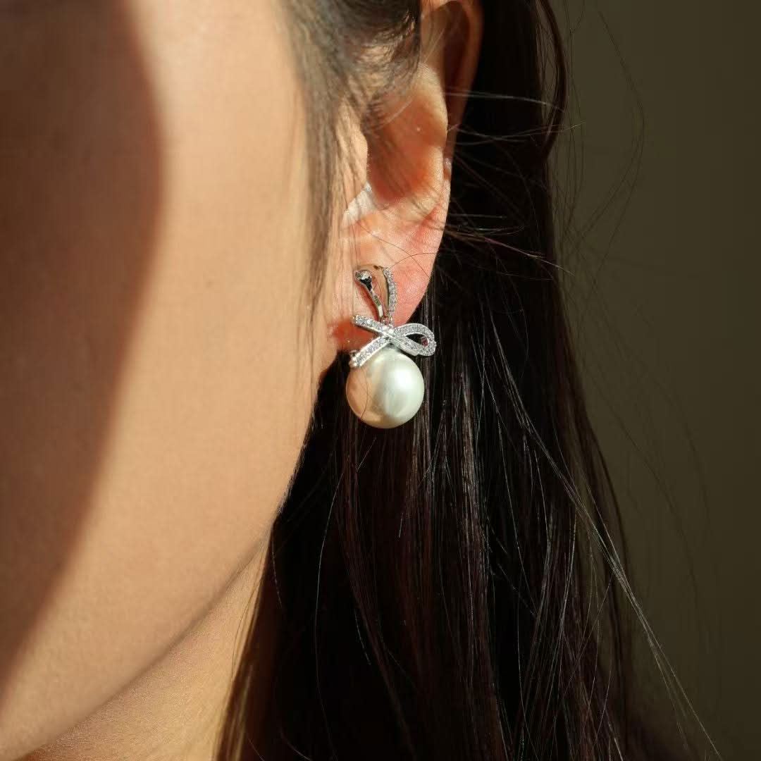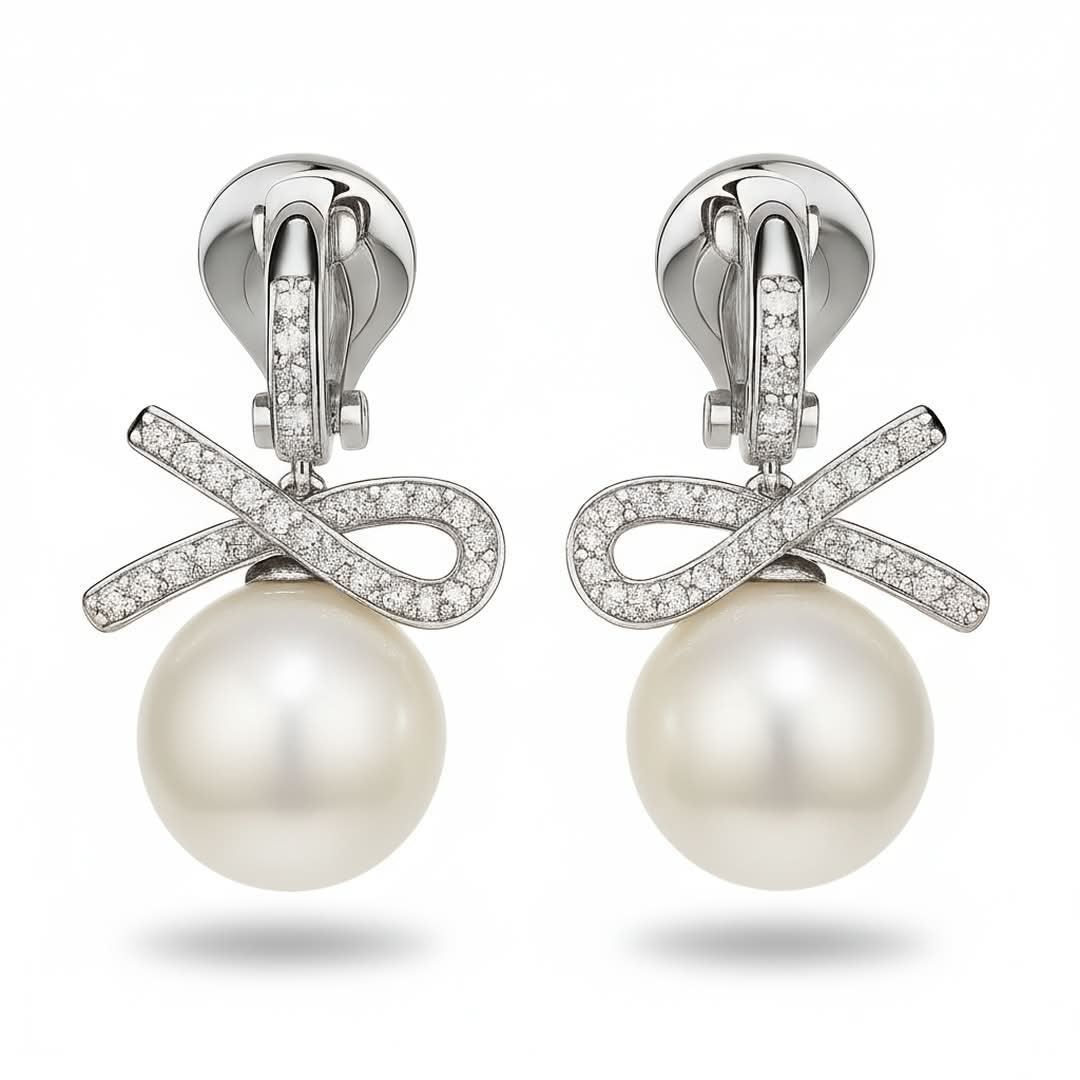 Orecchini Fiocco Zirconi Perla Donna Elegante - Clip Fiocco