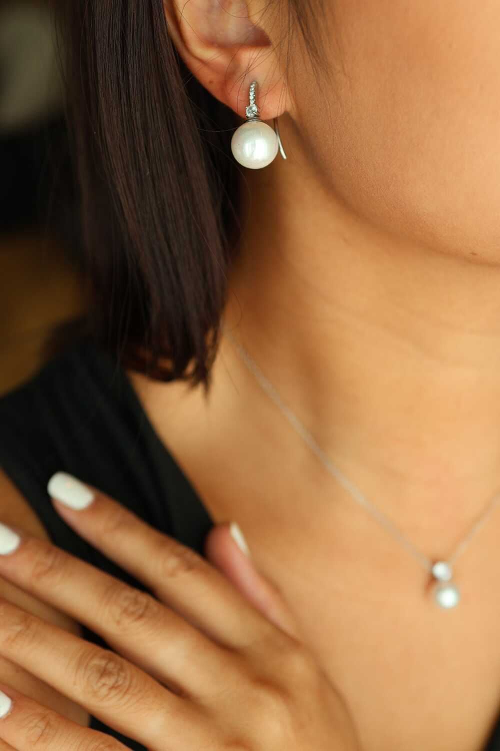 dal quale pende una magnifica perla sintetica di 12mm. La perla, con la sua lussuosa superficie liscia e iridescente,