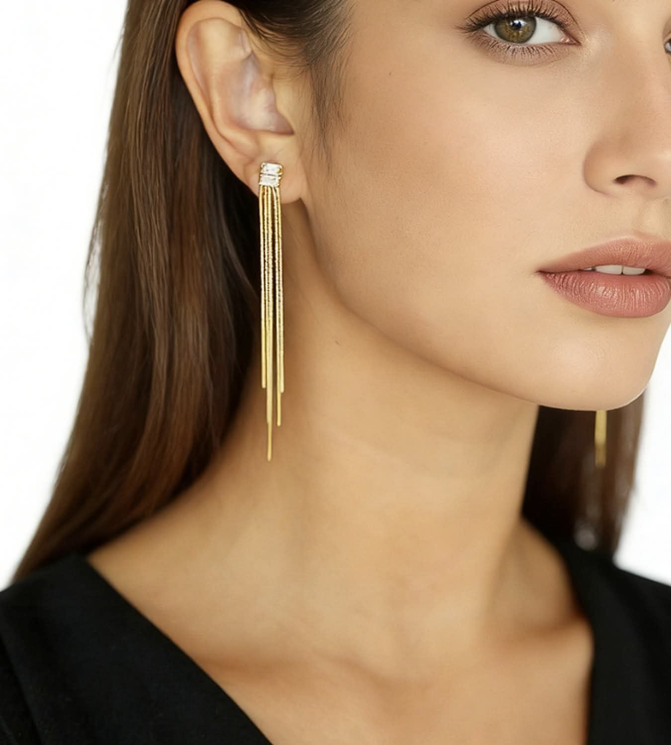 Orecchini Livia, disponibili in due colori (argento e oro), sono un'elegante aggiunta al tuo stile. Con una lunghezza di 75mm, i lunghi pendenti a frange creano un movimento grazioso. Abbelli da due scintillanti che donano un tocco di brillantezza