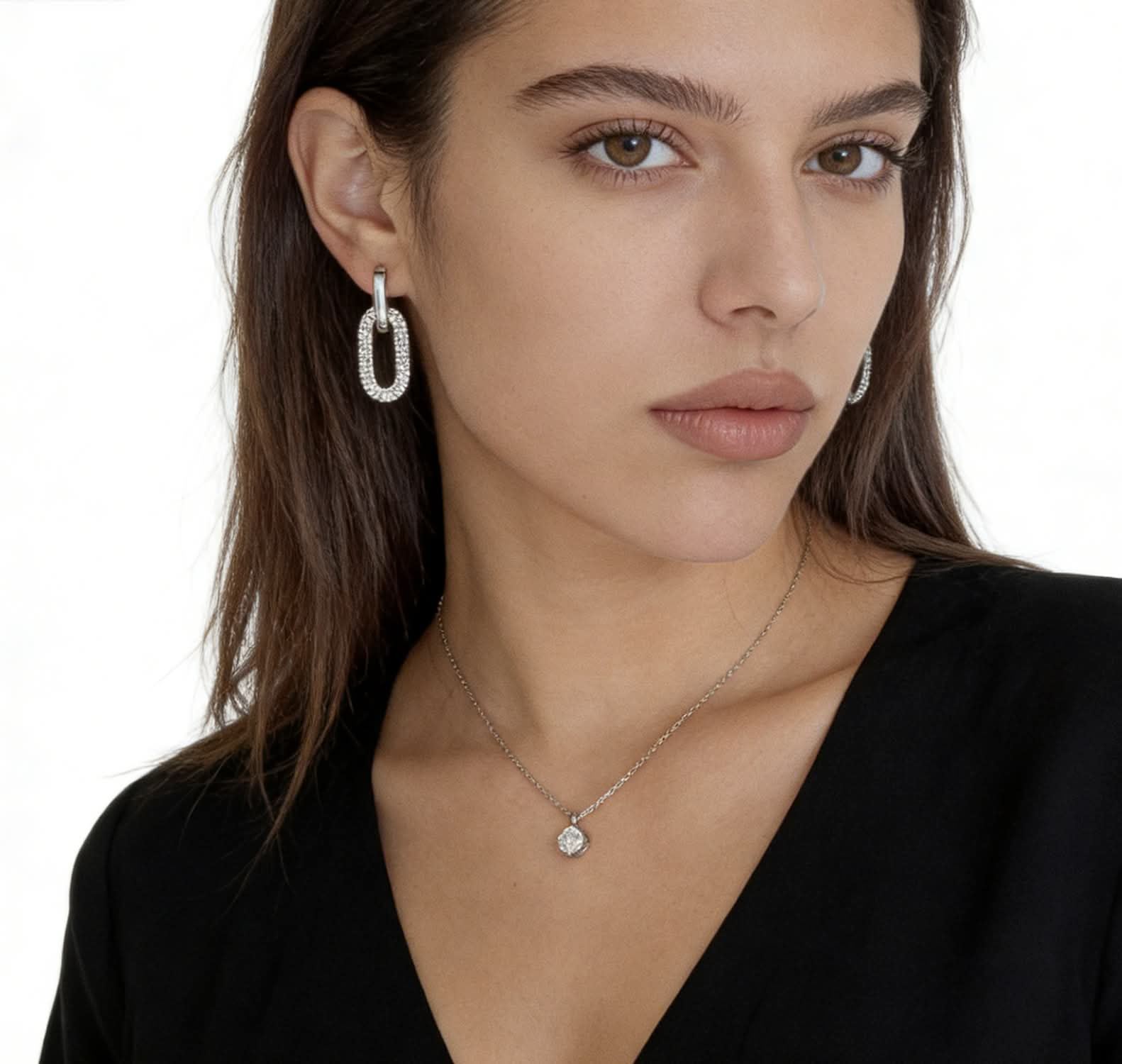 un cerchietto a cui è appeso un pendente a forma di anello ovale, con misure di 11.5mm X 22mm. Il pendente è interamente incastonato con scintillanti brillantini in zircone che, con la loro intensa brillantezza, donano al pezzo un bagliore affascinante e un tocco di lusso. La finitura disponibile nei colori argento e oro aggiunge un'aria di raffinatezza e eleganza.
