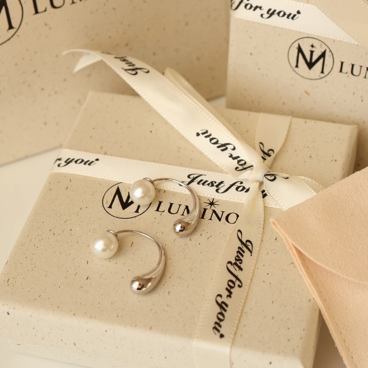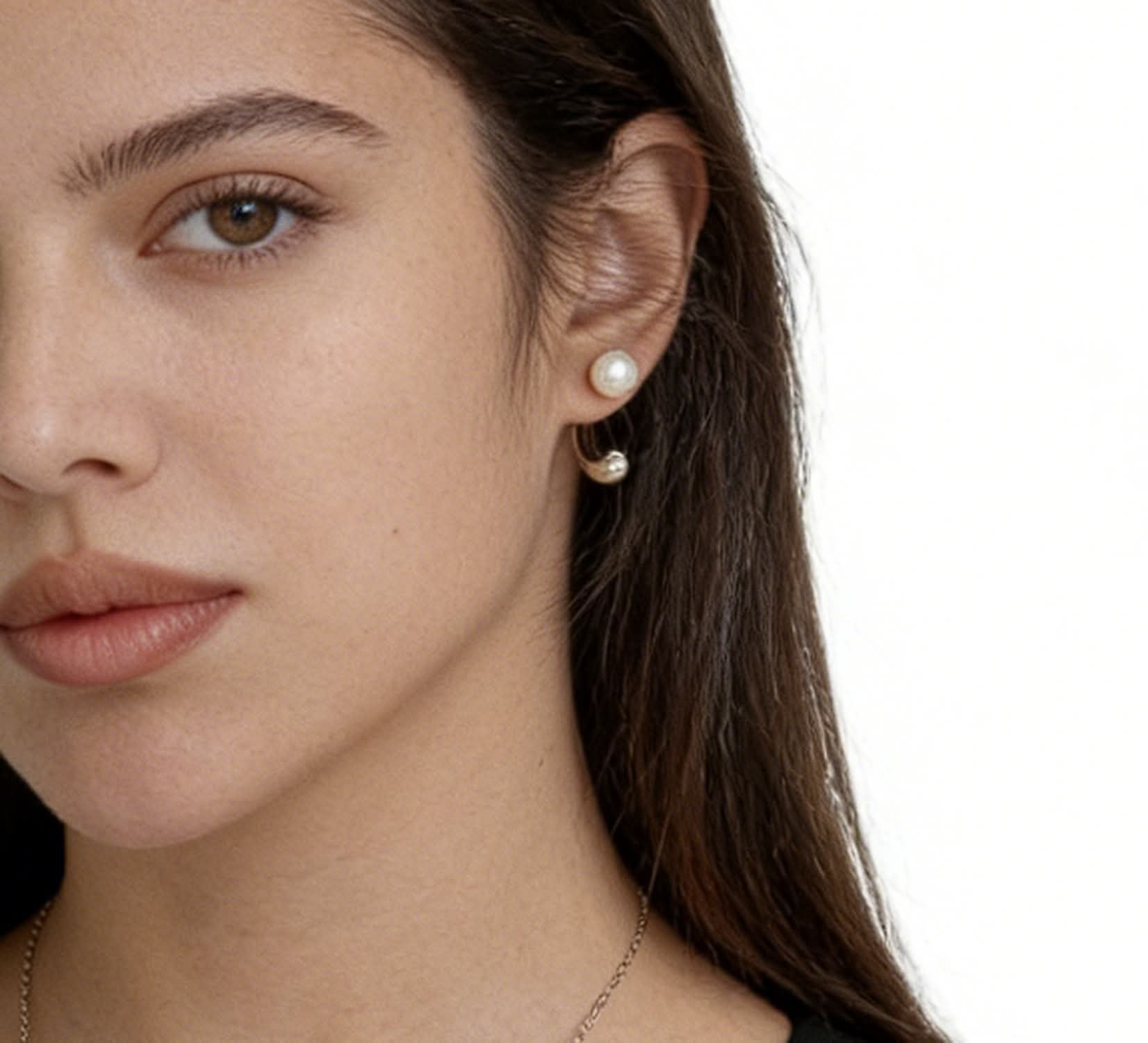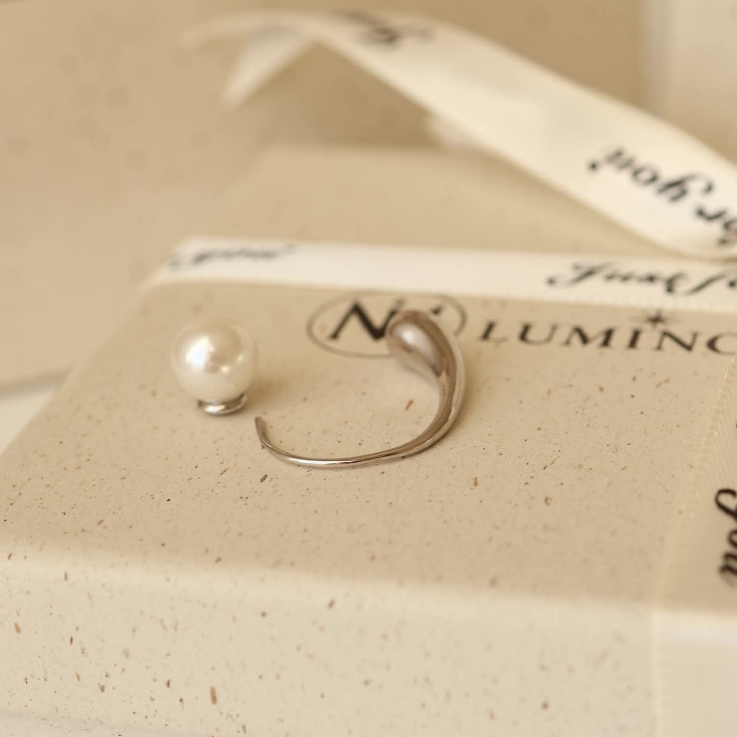 La perla, con la sua superficie liscia e luminosa, dona un'aria sofisticata e classica, mentre la forma curva aggiunge un tocco di modernità e fluidità.